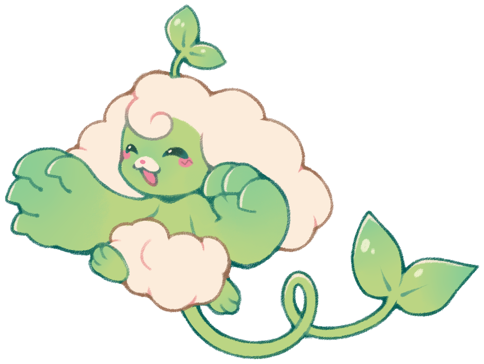Spriipaws are bouncy creatures found within the flora and foliage. With a sprout-like antenna on its head, and also a sprout-like tail, Spriipaws enjoy blending into gardens and nature to playfully spook passing faeliens by jumping out.